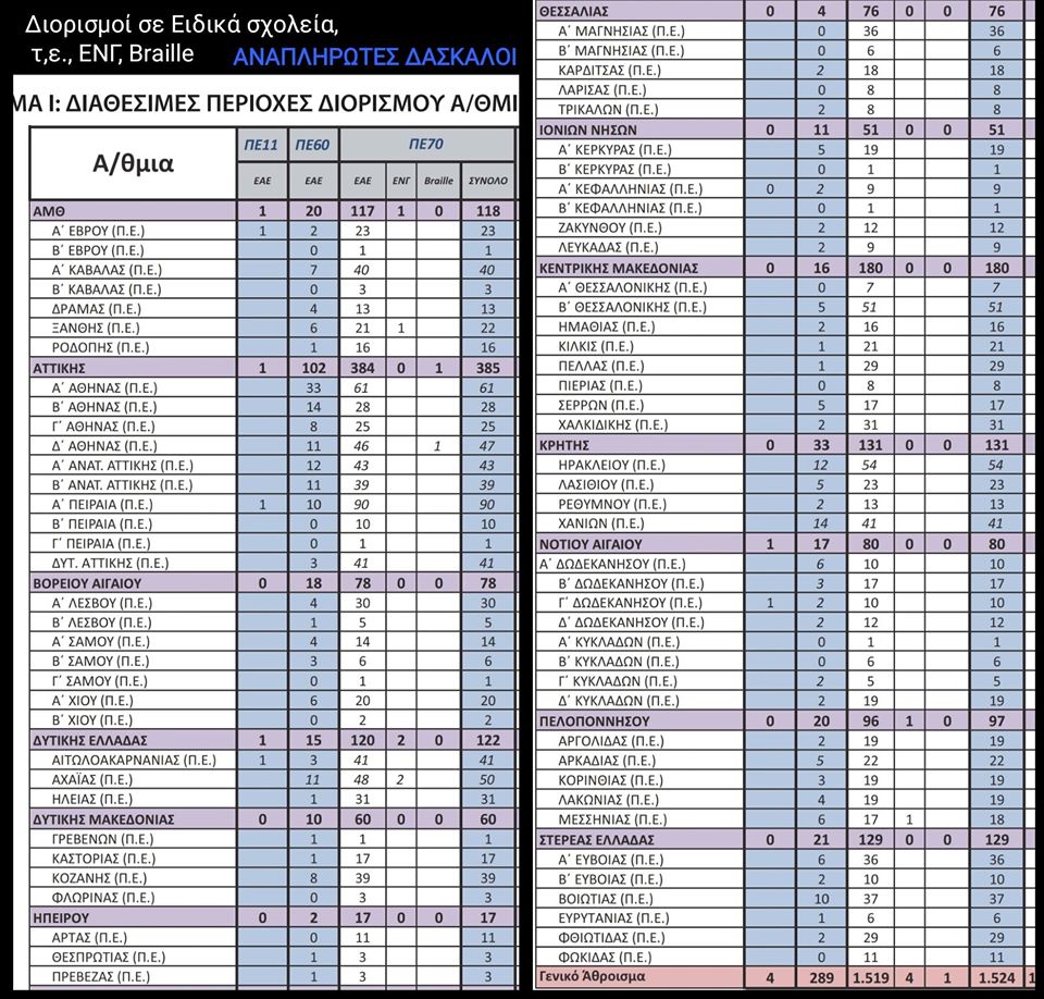 Συμβουλευτείτε τον πίνακα για την επιλογή περιοχών – Πίνακας για υποψήφιους της ειδικής αγωγής. Επιμέλεια πίνακα Αναπληρωτές Δάσκαλοι στο facebook.