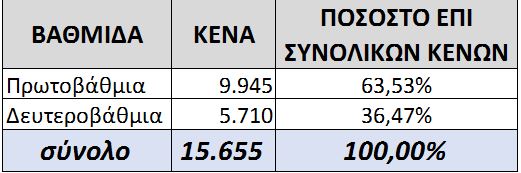 Τα κενά ανά περιοχή στην Πρωτοβάθμια έχουν ως εξής: