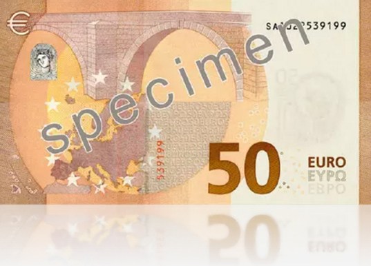 Μετά τα χαρτονομίσματα των 5, των 10 και των 20 ευρώ, έρχεται η ώρα του... λίφτινγκ και για το χαρτονόμισμα των 50 ευρώ! Το νέο χαρτονόμισμα, με αναβαθμισμένα χαρακτηριστικά προστασίας από τους παραχαράκτες, θα αρχίσει να κυκλοφορεί από τις 4 Απριλίου, και σταδιακά θα αντικαταστήσει τα “παλιά” χαρτονομίσματα. Όπως συμβαίνει και με τα άλλα νέας γενιάς χαρτονομίσματα, η ονομαστική αξία του 50ευρου θα αναγράφεται με σμαραγδί χρώμα, ενώ ως επιπλέον δικλείδα ασφαλείας θα διαθέτει ένα ολόγραμμα παραθύρου, μέσα στο οποίο, αν κανείς το κρατήσει στο φως, μπορεί να δει το πορτρέτο της Ευρώπης.