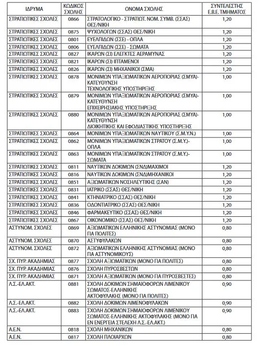 υποψηφίων των πανελλαδικών εξετάσεων στη διαδικασία επιλογής για εισαγωγή στις σχολές των Α.Σ.Ε.Ι. και Α.Σ.Σ.Υ., στη Σ.Σ.Α.Σ., στις σχολές της Αστυνομικής και Πυροσβεστικής Ακαδημίας, στις Α.Ε.Ν., στις σχολές Δοκίμων Σημαιοφόρων Λιμενικού Σώματος και Λιμενοφυλάκων, καθώς και στις Α.Σ.Τ.Ε. του Υπουργείου Τουρισμού.
