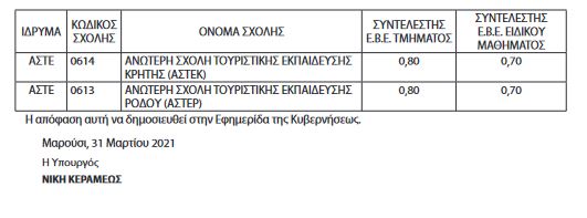 Kαθορισμός του συντελεστή Ελάχιστης Βάσης Εισαγωγής (Ε.Β.Ε.) ως προϋπόθεση συμμετοχής των υποψηφίων στις Πανελλήνιες 2021 στη διαδικασία επιλογής για εισαγωγή στις σχολές των Α.Σ.Ε.Ι. και Α.Σ.Σ.Υ., στη Σ.Σ.Α.Σ., στις σχολές της Αστυνομικής και Πυροσβεστικής Ακαδημίας, στις Α.Ε.Ν., στις σχολές Δοκίμων Σημαιοφόρων Λιμενικού Σώματος και Λιμενοφυλάκων, καθώς και στις Α.Σ.Τ.Ε. του Υπουργείου Τουρισμού
