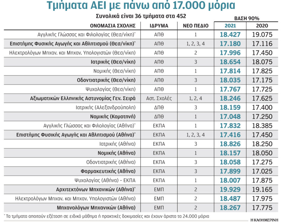 Ειδικότερα, σύμφωνα με την επεξεργασία των στοιχείων από τον μαθηματικό-αναλυτή Στράτο Στρατηγάκη, από τα 452 τμήματα του μηχανογραφικού δελτίου τα 36 είχαν βάση και τα τελευταία 5 χρόνια πάνω από 17.000 μόρια. Πρόκειται για τα 7 τμήματα Ιατρικής, τα 2 Οδοντιατρικής, το Φαρμακευτικής Αθήνας και τα 3 Νομικής. Στον κατάλογο υπάρχουν και 6 τμήματα που απαιτούν εξέταση σε ειδικό μάθημα και σε αυτά το άριστα είναι 24.000 μόρια ή 22.000 μόρια. Επίσης, σε αυτά περιλαμβάνονται τα επτά τμήματα της Στρατιωτικής Σχολής Αξιωματικών Σωμάτων (ΣΣΑΣ), που διαθέτουν λίγες θέσεις και προσφέρουν τη σιγουριά του Δημοσίου. Οι μηχανικοί της Ικάρων, οι αξιωματικοί της Αστυνομίας και της Πυροσβεστικής συμπληρώνουν τη δεκάδα με τις περιζήτητες σχολές ενστόλων.