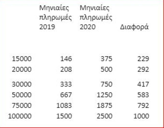 Τα όρια που φαίνονται και στον πίνακα που ακολουθεί είναι ατομικά αν και όποιος καταθέσει κοινή δήλωση με τον την σύζυγο θα μπορεί να εκμεταλλευτεί τις ηλεκτρονικές πληρωμές του για να καλύψει το δικό του όριο. Ο πίνακας που ακολουθεί δείχνει τη μηνιαία παραγωγή ηλεκτρονικών πληρωμών για πέρυσι και φέτος.