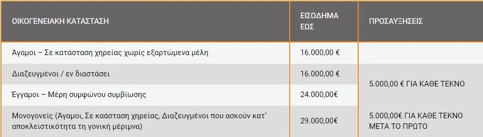 Η πλήρωση των εξής εισοδηματικών κριτηρίων του άρθ. 19 του ν. 4921/2022: το ετήσιο συνολικό οικογενειακό εισόδημα ανεξάρτητα από την πηγή προέλευσής του, πραγματικό και τεκμαρτό, δεν θα πρέπει να υπερβαίνει τα κάτωθι όρια: