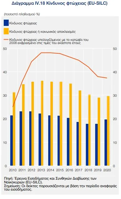 β) Το ποσοστό του πληθυσμού της χώρας που βρίσκεται σε κίνδυνο φτώχειας ή σε κοινωνικό αποκλεισμό, σύμφωνα με τον αναθεωρημένο ορισμό, αυξήθηκε σε 28,3% (ή 2.971 χιλιάδες άτομα), από 27,4% το 2019 και 29,0% το 2018. Σύμφωνα με την ίδια έρευνα, μεταξύ των χωρών της ΕΕ-27, η Ελλάδα εμφάνιζε το 2020 τον τρίτο υψηλότερο κίνδυνο φτώχειας ή κοινωνικού αποκλεισμού. Ο μέσος όρος ήταν 21,7% στις χώρες της ΕΕ-27.