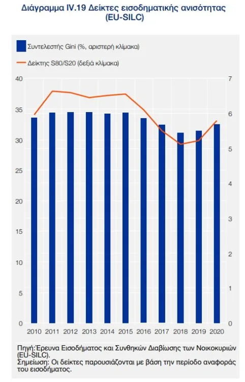 Ο δείκτης ανισότητας Gini αυξήθηκε στο 32,4% για τα εισοδήματα του 2020 (ΕΕ-27: 30,1%), από 31,4% για τα εισοδήματα του 2019. Αύξηση παρουσίασε και ο δείκτης S80/S20, από 5,2 για τα εισοδήματα του 2019 στο 5,8 για τα εισοδήματα του 2020 (ΕΕ-27: 5,0). 23 Στην αρχή της χρηματοπιστωτικής κρίσης (εισοδήματα 2008) οι δύο δείκτες ανισότητας ήταν 33,1% και 5,8 αντίστοιχα. Αντίθετα, ο δείκτης φτώχειας σε απόλυτους όρους, ο οποίος διατηρεί το κατώφλι φτώχειας σταθερό σε όρους πραγματικής αγοραστικής δύναμης του 2008, μειώθηκε στο 37,3% για τα εισοδήματα του 2020 (από 37,9% για τα εισοδήματα του 2019) συνεχίζοντας την πτωτική του πορεία από το 2015. Σημειώνεται ωστόσο ότι ο κίνδυνος φτώχειας υπολογιζόμενος με το παραπάνω κατώφλι φτώχειας ήταν μόλις 18,9% για τα εισοδήματα του 2008. Ο ίδιος δείκτης στην ΕΕ είναι αισθητά χαμηλότερος, 13,0% για τα εισοδήματα του 2020. Ευνοϊκά μεταβλήθηκε και το χάσμα ή βάθος της σχετικής φτώχειας, 24 σημειώνοντας πτώση στο 26,4% το 2020, από 27,3% για τα εισοδήματα του 2019.