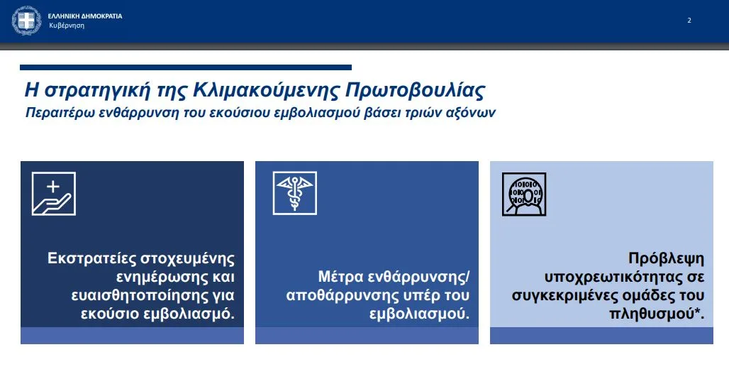 Σύμφωνα με τον υπουργό ο στόχος είναι να προσέλθουν όσο το δυνατόν περισσότεροι πολίτες να εμβολιαστούν, να δημιουργήσουμε πλέγμα προστασίας της δημόσιας υγείας όπου υπάρχει συγχρωτισμός και να αποκατασταθεί η ελευθερία όσων έχουν ήδη εμβολιαστεί.