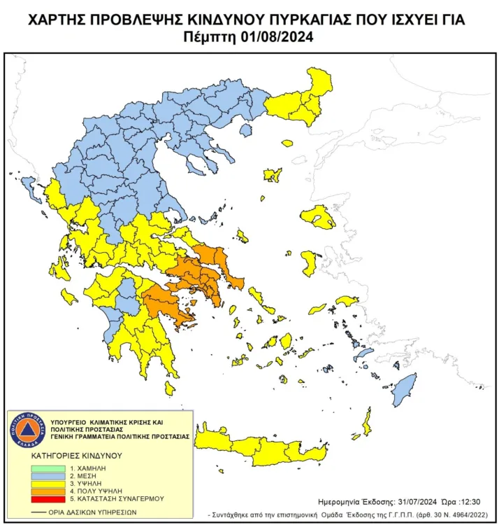 Πολύ υψηλός κίνδυνος πυρκαγιάς (κατηγορία κινδύνου 4) προβλέπεται σήμερα Πέμπτη σε αρκετές περιφέρειες της χώρας, σύμφωνα με το Χάρτη Πρόβλεψης Κινδύνου Πυρκαγιάς που εκδίδει η γενική γραμματεία Πολιτικής Προστασίας του υπουργείου Κλιματικής Κρίσης & Πολιτικής Προστασίας (civilprotection.gov.gr).