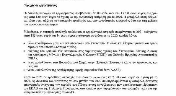 Oι τακτικές αποδοχές καθώς και οι εργοδοτικές εισφορές αναμένονται το 2021 αυξημένες κατά 185 εκατομμύρια ευρώ και 34 εκατομμύρια ευρώ αντίστοιχα σε σχέση με το 2020 για νέες προσλήψεις εκπαιδευτικών στο Υπουργείο Παιδείας και προσλήψεις στο Εθνικό Σύστημα Υγείας.