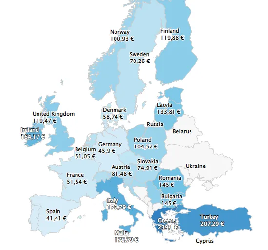 Το φθηνότερο ρεύμα στην Ευρώπη έχουν η Ισπανία και η Πορτογαλία, με 41,41 ευρώ ανά MWh και ακολουθούν το Λουξεμβούργο και η Γερμανία με 45,90 ευρώ ανά MWh, το Βέλγιο (51,05 ευρώ ανά MWh) και η Γαλλία (51,54 ευρώ ανά MWh).