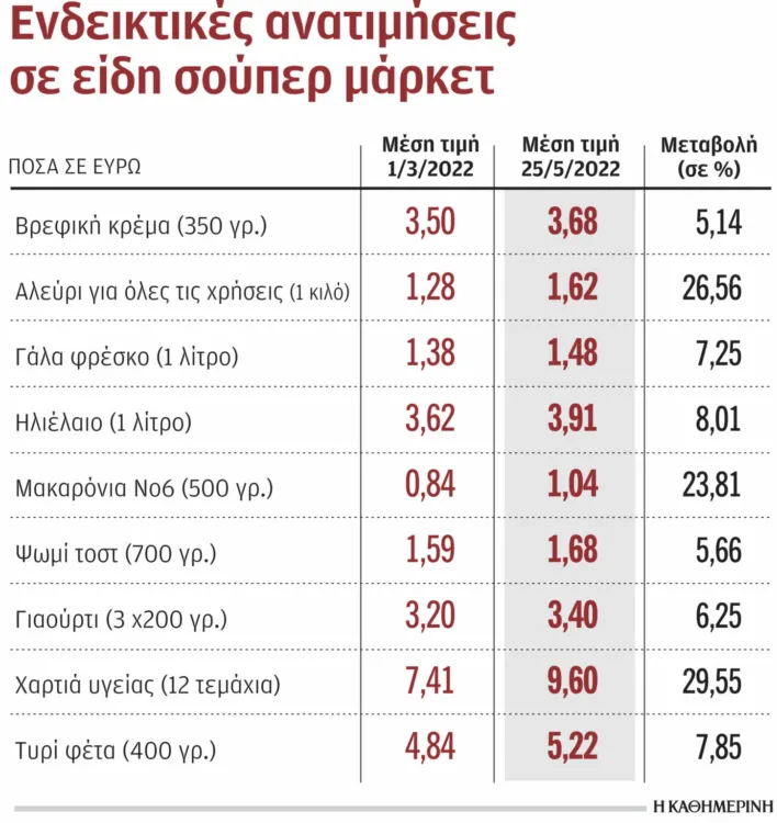 Σύμφωνα με την ΚΑΘΗΜΕΡΙΝΗ , η συνέχιση των αυξήσεων στα είδη διατροφής που στην Ελλάδα υστέρησε χρονικά σε σύγκριση με τις άλλες ευρωπαϊκές χώρες, καθώς και η εκτόξευση των τιμών των καυσίμων σε δυσθεώρητα ύψη αναμένεται να διατηρήσουν τον πληθωρισμό σε πολύ υψηλά επίπεδα και τον Μάιο.