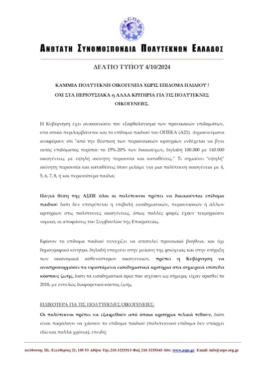 Με την συγκεκριμένη ανακοίνωση, τα μέλη της Συνομοσπονδίας τονίζουν πως όλες οι οικογένειες που έχουν την πολυτεκνική ιδιότητα πρέπει να λαμβάνουν, χωρίς κριτήρια, το επίδομα παιδιού του ΟΠΕΚΑ, www.opeka.gr, διότι στόχος του Κράτους είναι να αυξηθούν οι γεννήσεις (οι πολύτεκνοι διαχρονικά βοηθούν σε αυτό) και να αποτελέσουν οι πολύτεκνες οικογένειες πρότυπο-επιδίωξη και για τις άλλες οικογένειες της Ελλάδας, ώστε το ανθρώπινο κεφάλαιο αυτής της χώρας να μην μειωθεί άλλο, ειδικά φέτος που οι θάνατοι θα είναι διπλάσιοι από τις γεννήσεις.