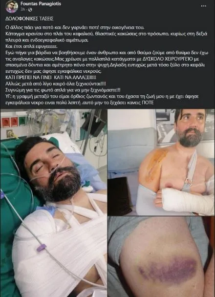«Ο άλλος πάει για ποτό και δεν γυρνάει ποτέ στην οικογένεια του. Κάταγμα κρανίου στο πλάι του κεφαλιού, θλαστικές κακώσεις στο πρόσωπο, κυρίως στη δεξιά πλευρά και ενδοεγκεφαλικό αιμάτωμα. Και έτσι απλά εφυγεεεεε. Εγώ πήγα για βάρδια να βοηθήσουμε έναν άνθρωπο και από θαύμα ζούμε από θαύμα δεν έχω τις αναλογες κακώσεις.Μας χρέωσε με πολλαπλά κατάγματα με ΔΥΣΚΟΛΟ ΧΕΙΡΟΥΡΓΕΊΟ με σπασμένα δόντια και αμέτρητο πόνο στην ψυχή.Δηλαδη ευτυχώς μετά τόσο ξύλο στο κεφάλι ευτυχώς δεν μας άφησε εγκεφάλικα νεκρούς. ΚΑΤΙ ΠΡΕΠΕΙ ΝΑ ΓΙΝΕΙ ΚΑΤΙ ΝΑ ΑΛΛΑΞΕΙ!!!! Αλλιώς μετά από λίγο καιρό όλα ξεχνιούνται!!!! Συγνώμη για τις φωτό απλά για να μην ξεχνιόμαστε!!! ΥΓ: η γραμμή μεταξύ του είμαι όρθιος ζωντανός και του έχασα τη ζωή μου η με έχει άφησε εγκεφάλικα νεκρο ειναι πολύ λεπτή. Aυτό μην το ξεχάσει κανεις ΠΟΤΕ»
