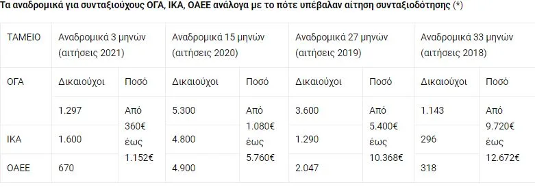 Σύμφωνα με ενδεικτικά στοιχεία από τις ημερομηνίες των αρχικών αιτήσεων συνταξιοδότησης, αναδρομικά 33 μηνών δικαιούνται 1.143 συνταξιούχοι του ΟΓΑ, 318 από τον ΟΑΕΕ και 296 από το ΙΚΑ που είχαν κάνει αίτηση από το 2018. Αναδρομικά ως 27 μήνες με αιτήσεις από το 2019 δικαιούνται 3.600 συνταξιούχοι του ΟΓΑ, 2.047 του ΟΑΕΕ και 1.290 του ΙΚΑ και αναδρομικά ως 15 μήνες θα έχουν οι περισσότεροι εν αναμονή συνταξιούχοι με αιτήσεις συνταξιοδότησης το 2020.