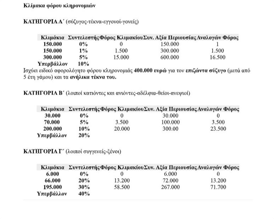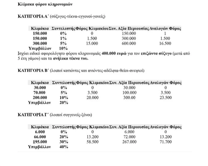 Για τους συζύγους, τα παιδιά και τα εγγόνια το αφορολόγητο όριο διαμορφώνεται στα 150.000 ευρω. Εάν η συνολική άξια της κληρονομιάς (δηλαδή μαζί με τα αναδρομικά) δεν ξεπερνά το συγκεκριμένο όριο τότε και τα αναδρομικά θα είναι αφορολόγητα. Αλλιώς θα φορολογηθούν βάσει κλίμακας (βλ. πινάκα).