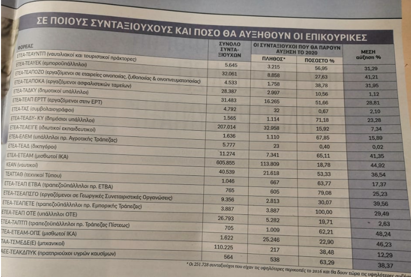 Αποκατάσταση των επικουρικών συντάξεων, στις περιπτώσεις που το άθροισμα επικουρικής-κύριας υπερέβαινε το ποσό των 1.300 ευρώ, οι οποίες περικόπηκαν το 2016, γεγονός που αφορά εκατοντάδες χιλιάδες συνταξιούχους. Οι αυξήσεις στις επικουρικές θα ξεκινούν με ποσά έως 5 ευρώ για το 5% των χαμηλότερων επικουρικών και θα κλιμακώνονται έως 196,10 ευρώ για το 5% των υψηλότερων επικουρικών. Υπολογίζεται ότι η μεσοσταθμική αύξηση θα είναι 99,57 ευρώ.