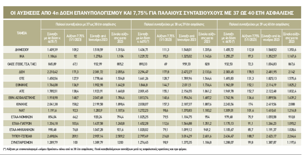 *Στο ΤΣΠΕΑΘ (Ταμείο Τύπου), η μέση σύνταξη για συνταξιούχους που πήραν αύξηση λόγω επανυπολογισμού με 38 ως 39 έτη διαμορφώνεται σε 2.797,49 ευρώ και με την αύξηση 7,75% θα ανέλθει σε 3.014,29 ευρώ (+216,8 ευρώ).