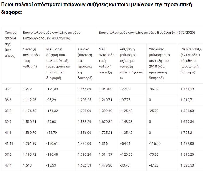 Απόστρατος του 2018 (νόμος Κατρούγκαλου) με 40 έτη και μισθό 2.800 ευρώ παίρνει σύνταξη 1.582 ευρώ μικτά ενώ με τον επανυπολογισμό του νόμου Βρούτση θα πάρει 1.784 ευρώ με αύξηση κατά 202 ευρώ το μήνα από Ιούνιο και αναδρομικά 3.838 ευρώ.