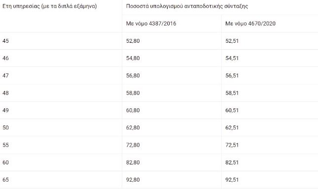Οσοι έχουν πάνω από 45 έτη με τους χρόνους που υπολογίζονται στο διπλάσιο (πτητικά, καταδυτικά εξάμηνα Ειδικών Δυνάμεων κ.λπ.) δεν θα δουν καμία διαφορά και θα διατηρήσουν τον παλιό επανυπολογισμό που είχαν από το νόμο Κατρούγκαλου, γιατί μετά το 45ο έτος ο νέος νόμος (4670/2020) δίνει μικρότερο ποσό σύνταξης έναντι του νόμου Κατρούγκαλου.