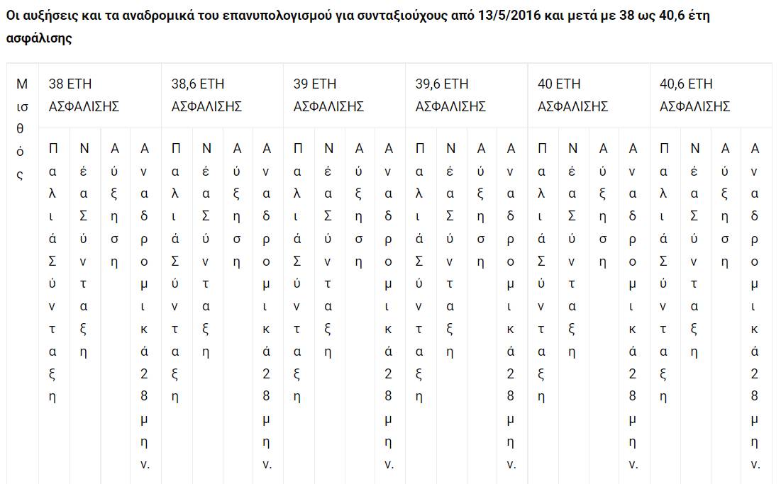 Σύμφωνα με τον Ελεύθερο Τύπο, πιο αναλυτικά, για τους επανυπολογισμούς συντάξεων με αποχώρηση μετά τον Μάιο του 2016 και μέχρι 30/9/2019, τα ποσά αυξήσεων και αναδρομικών (μικτά) που θα λάβουν οι συνταξιούχοι, ανάλογα με τα έτη ασφάλισης και τον μέσο μισθό που είχαν πριν βγουν στη σύνταξη, διαμορφώνονται ως εξής: