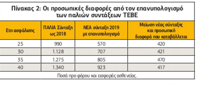 - Συνταξιούχος ΤΕΒΕ με 25 χρόνια είχε ως το 2018 σύνταξη 990 ευρώ. Με τον επανυπολογισμό η νέα σύνταξη βγαίνει στα 570 ευρώ. Η διαφορά νέας με παλιά σύνταξη είναι 420 ευρώ, δηλαδή 42,5% λιγότερα! Ο συνταξιούχος όταν πάρει το ενημερωτικό στα χέρια του θα δει ότι η νέα του σύνταξη είναι 570 ευρώ με συμπλήρωμα προσωπικής διαφοράς 420 ευρώ για να μην πέσει από αυτά που είχε στην παλιά του σύνταξη (πίνακας 2).