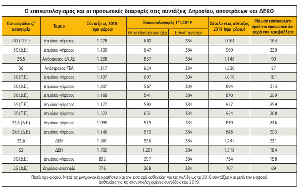 Στον πίνακα με τα επίσημα στοιχεία των νέων επανυπολογισμένων συντάξεων Δημοσίου, αποστράτων και ΔΕΚΟ (ΔΕΗ) που αποκαλύπτει σήμερα το ένθετο «Ασφάλιση και Συντάξεις» φαίνεται ότι: