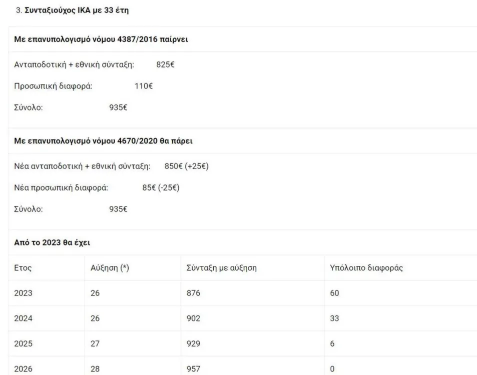 Συνταξιούχος ΙΚΑ με 33 έτη μετά τον επανυπολογισμό του νόμου Κατρούγκαλου παίρνει σύνταξη 825 ευρώ και προσωπική διαφορά 110 ευρώ. Με τον επανυπολογισμό του νόμου Βρούτση θα πάρει 850 ευρώ σύνταξη με αύξηση 25 ευρώ και θα του μείνουν 85 ευρώ από την προσωπική διαφορά, που θα τη μηδενίσει σταδιακά με αυξήσεις από το 2023 ως το 2025.