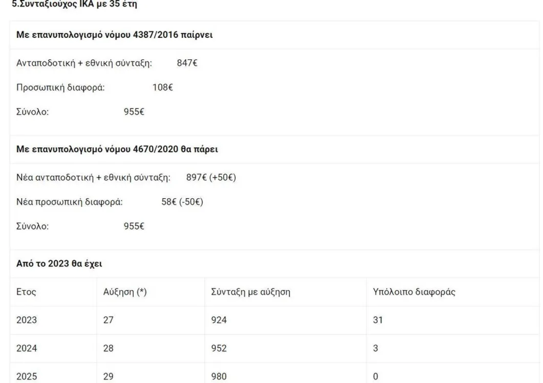 Συνταξιούχος ΙΚΑ με 35 έτη μετά τον επανυπολογισμό του νόμου Κατρούγκαλου παίρνει σύνταξη 847 ευρώ και προσωπική διαφορά 108 ευρώ. Με τον επανυπολογισμό του νόμου Βρούτση θα πάρει 897 ευρώ σύνταξη με αύξηση 50 ευρώ και θα του μείνουν 58 ευρώ από την προσωπική διαφορά, που θα τη μειώσει με τις αυξήσεις του 2023 και του 2024 και από το 2025 θα έχει πραγματική αύξηση χωρίς προσωπική διαφορά με τη σύνταξη στα 980 ευρώ.