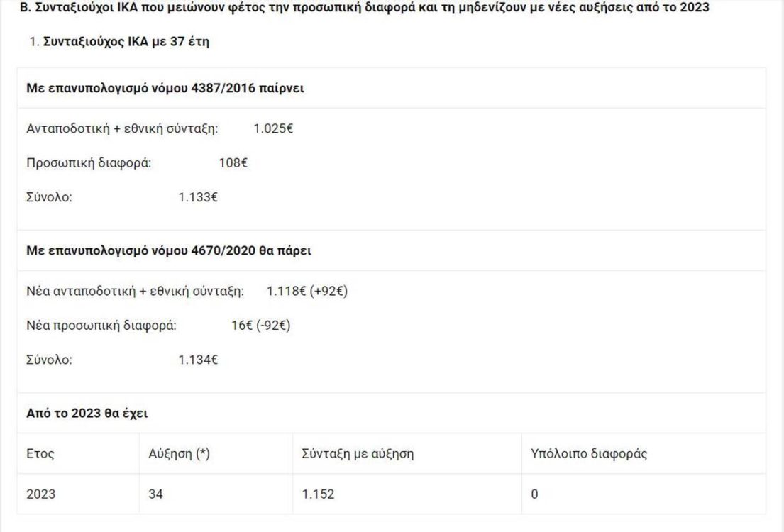 Συνταξιούχος ΙΚΑ με 37 έτη μετά τον επανυπολογισμό του νόμου Κατρούγκαλου παίρνει σύνταξη 1.025 ευρώ και προσωπική διαφορά 108 ευρώ. Με τον επανυπολογισμό του νόμου Βρούτση θα πάρει 1.118 ευρώ σύνταξη με αύξηση 92 ευρώ και θα του μείνουν 16 ευρώ από την προσωπική διαφορά που θα τη μηδενίσει με την πρώτη αύξηση του 2023, οπότε και η σύνταξη θα έχει πραγματική αύξηση χωρίς προσωπική διαφορά και θα ανέλθει στα 1.152 ευρώ.