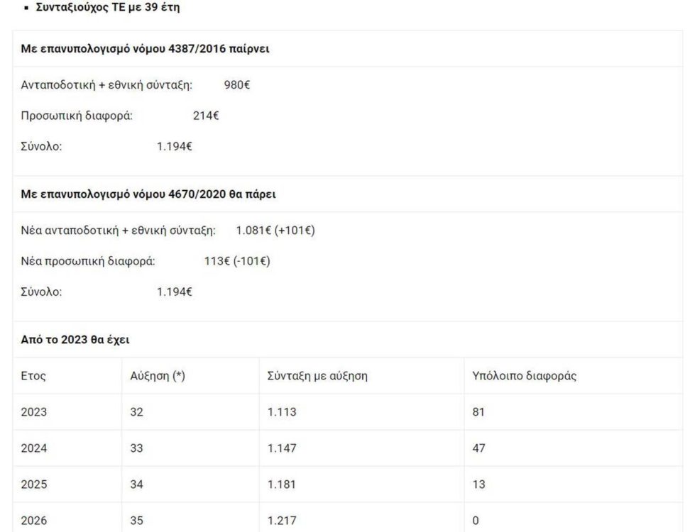 Συνταξιούχος ΙΚΑ με 40 χρόνια που παίρνει από τον επανυπολογισμό του νόμου Κατρούγκαλου ανταποδοτική και εθνική σύνταξη 1.115 ευρώ με προσωπική διαφορά 89 ευρώ, θα έχει από τον επανυπολογισμό του νόμου Βρούτση αύξηση κατά 127 ευρώ, από την οποία τα 89 ευρώ θα «σβήσουν» την προσωπική διαφορά και τα υπόλοιπα 38 ευρώ θα μείνουν ως καθαρή αύξηση στην τσέπη με δόσεις από τον Ιούλιο.