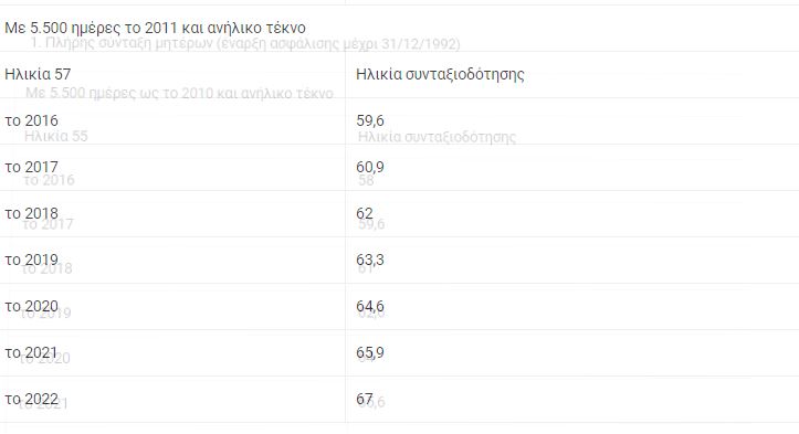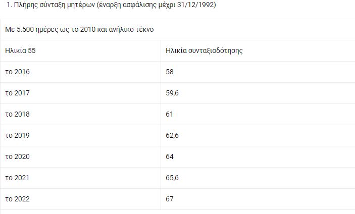 - Μητέρες που ασφαλίστηκαν πριν από το 1993 στο ΙΚΑ και συμπλήρωσαν ως το 2012 τις 5.500 ημέρες ασφάλισης με ανήλικο παιδί. Το όριο ηλικίας καθορίζεται στο έτος που συμπληρώνουν την παλιά ηλικία που θα έπαιρναν σύνταξη. Για παράδειγμα, ασφαλισμένη με ανήλικο και 5.500 ένσημα το 2010 θα έπαιρνε πλήρη σύνταξη στα 55. Αν τα έκλεισε το 2017, έχει νέο όριο ηλικίας για συνταξιοδότηση, που είναι 59 ετών και 5 μήνες.