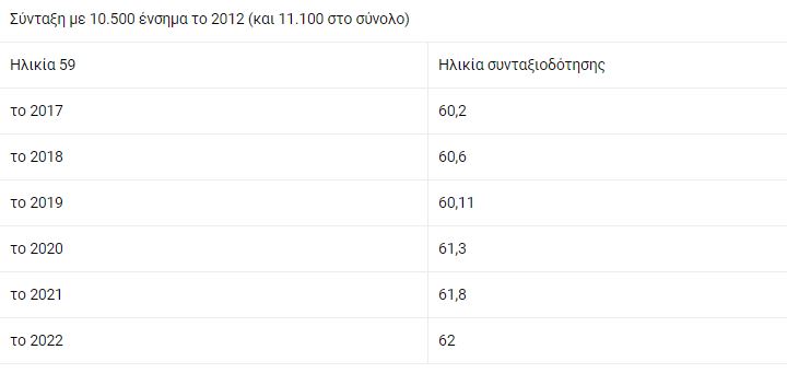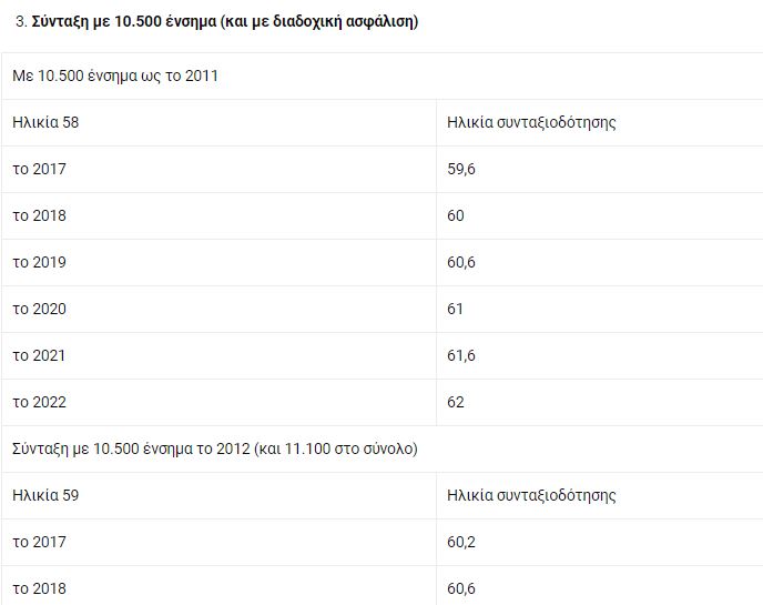 - Ασφαλισμένοι στο ΙΚΑ που συμπληρώνουν με πραγματικό ή πλασματικό χρόνο, ή και με διαδοχική ασφάλιση, την 35ετία (10.500 ένσημα) ως το 2012. Το νέο όριο ηλικίας (από 19/8/2015 και μετά) καθορίζεται ανάλογα με το πότε κλείνουν το 58ο ή το 59ο έτος, που ήταν οι παλιές ηλικίες συνταξιοδότησης. Για παράδειγμα, με 10.500 ένσημα το 2011 κατοχυρώνουν το 58ο έτος. Οσοι τα έκλεισαν το 2018 θα πάρουν σύνταξη στα 60. Οσοι όμως κλείνουν τα 58 ή τα 59 μετά το 2022 θα πάρουν σύνταξη στα 62 χωρίς να ζητηθούν περισσότερα ένσημα. Προσοχή: Οσοι συμπληρώνουν τα 10.500 ένσημα μετά την 1η/1/2013 θα βγουν στα 62 με 12.000 ένσημα (40 χρόνια).