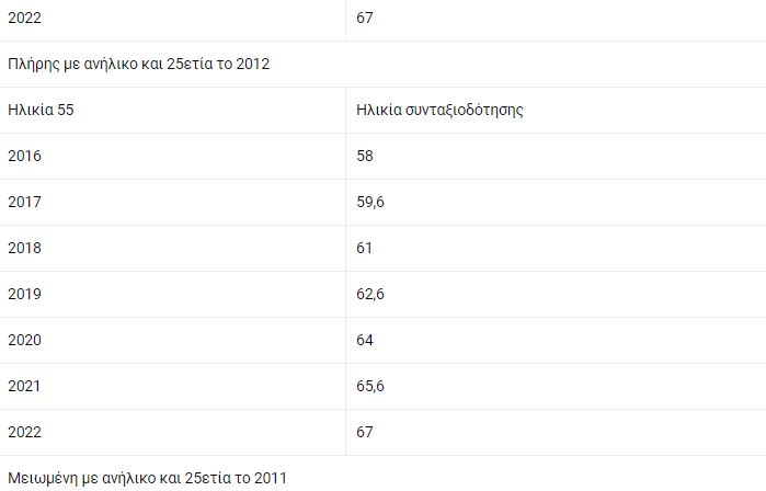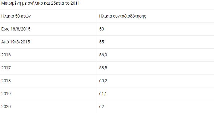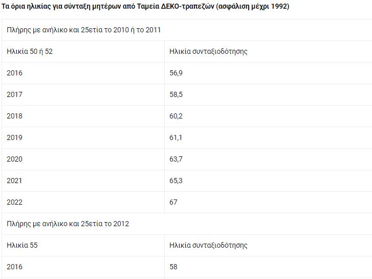 - Μητέρες ασφαλισμένες σε Ταμεία ΔΕΚΟ-τραπεζών πριν από το 1993 που είχαν ανήλικο τέκνο και 25ετία ως το 2012. Με τις προϋποθέσεις αυτές κατοχυρώνουν τις ηλικίες των 50, 52 και 55 ετών για πλήρη σύνταξη αλλά από 19/8/2015 και μετά αποχωρούν με τα νέα όρια συνταξιοδότησης. Για παράδειγμα, ασφαλισμένη με 25ετία το 2011 και ανήλικο που έκλεισε τα 52 το 2017 βγαίνει στα 58,5 με πλήρη σύνταξη.