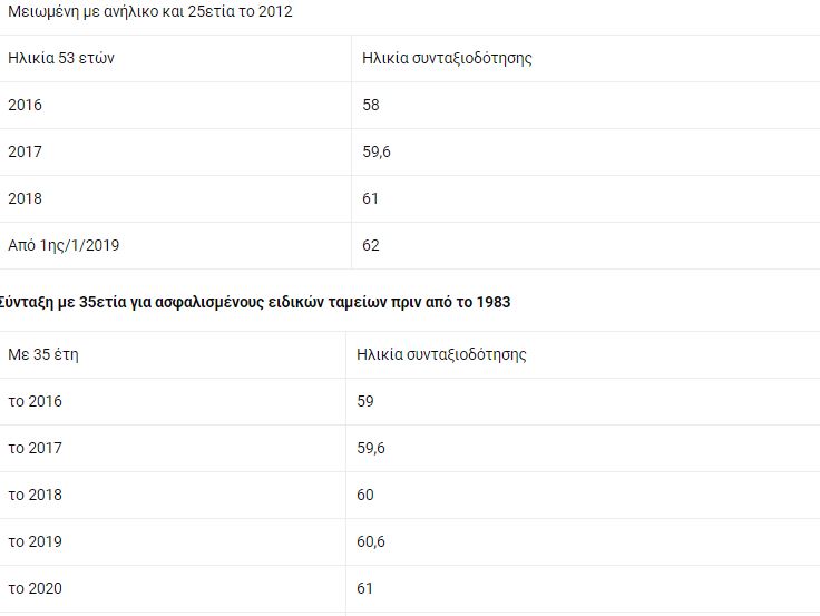 - Ανδρες-γυναίκες με ένσημα πριν από το 1983 σε ειδικά ταμεία (ΔΕΚΟ-τραπεζών-Τύπου) βγαίνουν με το όριο ηλικίας που ισχύει για την ηλικία των 58 ετών κατά τη χρονιά που συμπληρώνουν 35ετία. Για παράδειγμα, ασφαλισμένος με 35ετία το 2019 θα βγει στα 60,6, ενώ αν εξαγοράσει δύο έτη στρατιωτικής θητείας και έχει την 35ετία το 2017 αποχωρεί στα 59,5.