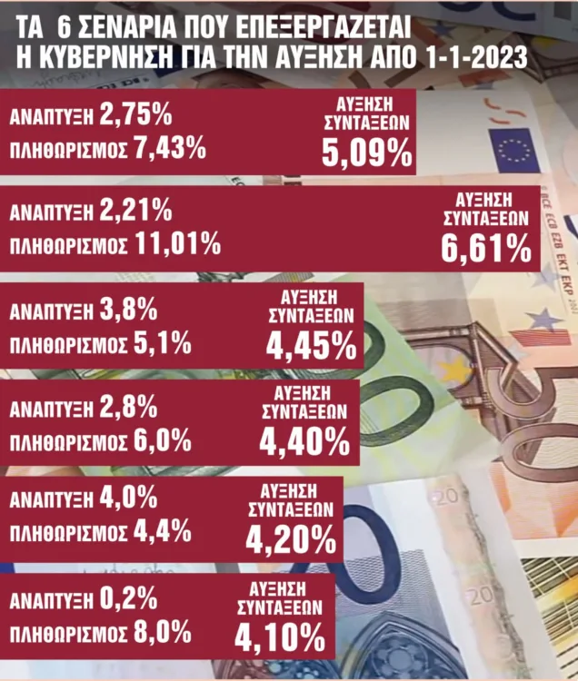 Ηδη στο τραπέζι βρίσκονται έξι σενάρια. Το ύψος των αυξήσεων θα κλειδώσει μέσα στους επόμενους μήνες, καθώς θα εξαρτηθεί από το ποσοστό της ανάπτυξης, αλλά και του πληθωρισμού του τρέχοντος έτους. Πιο συγκεκριμένα, οι αυξήσεις στις συντάξεις θα είναι ίσες με το 50% της μεταβολής του ΑΕΠ και επίσης 50% της μεταβολής του Δείκτη Τιμών Καταναλωτή (τιμάριθμος) όπως ορίζει ο νόμος και σε κάθε περίπτωση δεν θα πρέπει να είναι υψηλότερες του πληθωρισμού.