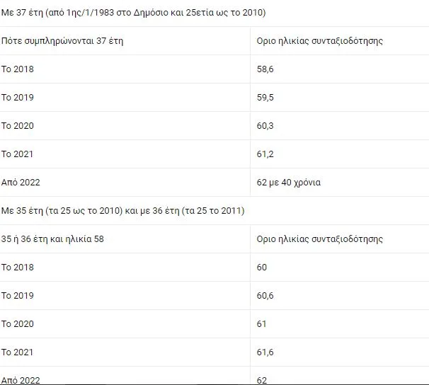 - Εξοδος με 37ετία για υπαλλήλους που διορίστηκαν μετά το 1983 και έχουν 25ετία ως το 2010. Στην 37ετία μετρούν και τα χρόνια ασφάλισης πριν από το 1983 σε άλλο Ταμείο. Οσοι αποχωρούν με 37ετία θα έχουν κλείσει τα 55. Υπάλληλος που έχει 37 χρόνια το 2020 θα συνταξιοδοτηθεί στα 60,3, ακόμη και αν τα κλείνει μετά το 2022.