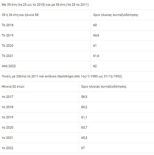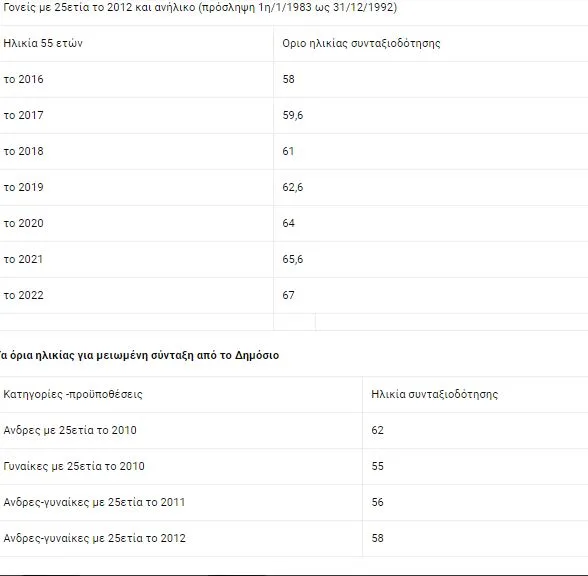 Για τους νέους ασφαλισμένους από 1ης/1/1993 και μετά, τα όρια ηλικίας είναι 67 ή 62 με 40 έτη για πλήρη σύνταξη και 62 για μειωμένη.