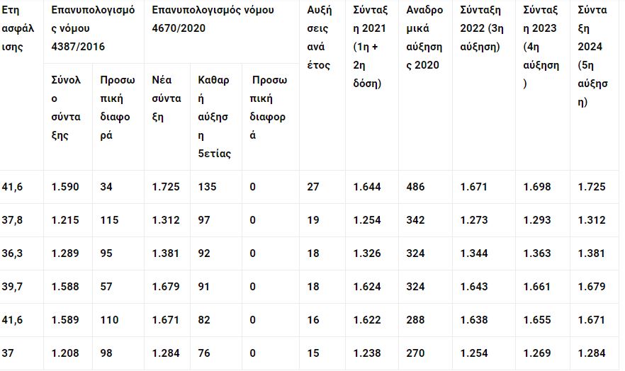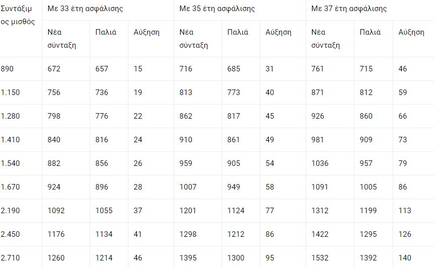 Οι αυξήσεις θα είναι σημαντικές με τα ενδεικτικά ποσά στους σχετικούς πίνακες που δημοσιεύει ο Ελεύθερος Τύπος, ξεκινούν από τα 15 με 30 ευρώ τον μήνα για όσους έχουν 33 – 35 έτη και συνταξιοδοτήθηκαν με μισθούς κάτω των 1.000 ευρώ, ενώ όσο ανεβαίνουν οι μισθοί και τα έτη ασφάλισης, ανεβαίνουν και οι αυξήσεις, φθάνοντας ως τα 140 ευρώ με 37 έτη, ως τα 200 ευρώ με 39,9 έτη και ως τα 204 ευρώ με 40 έτη.