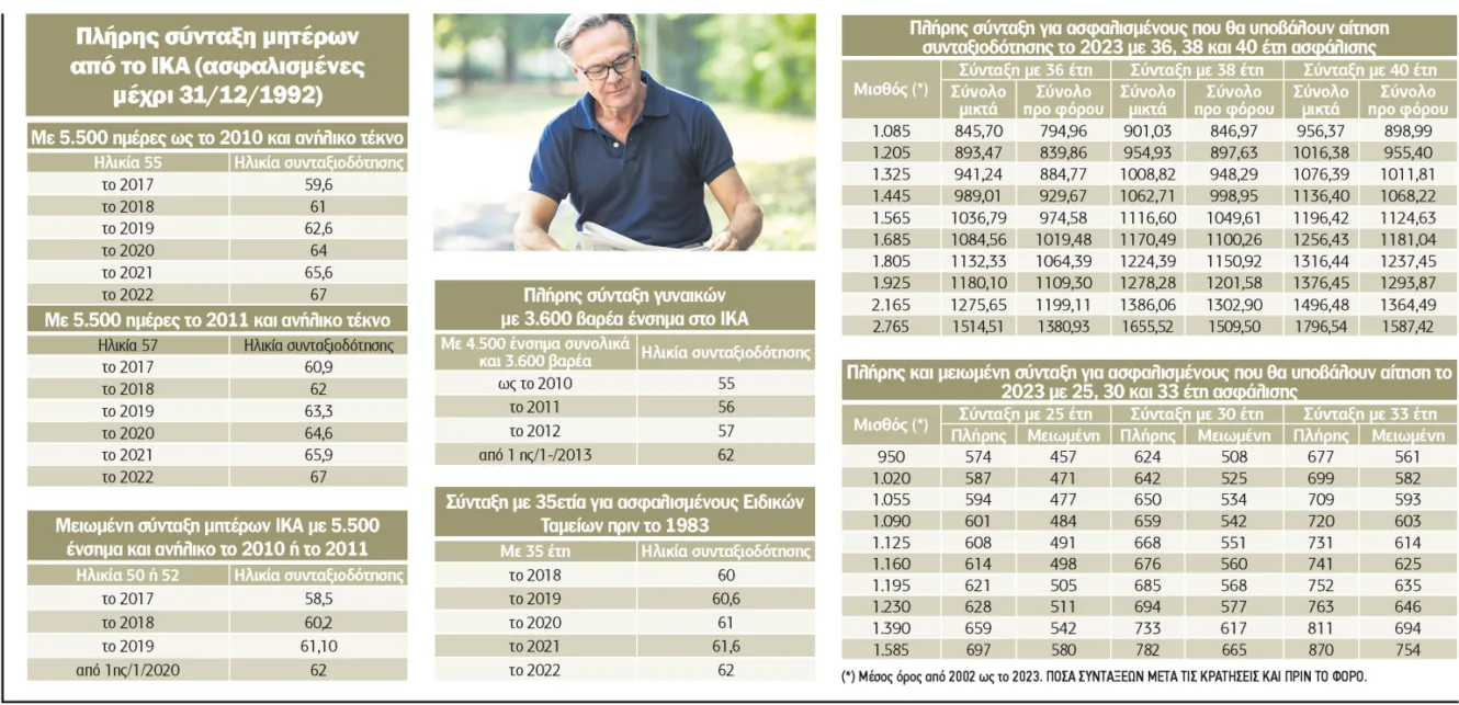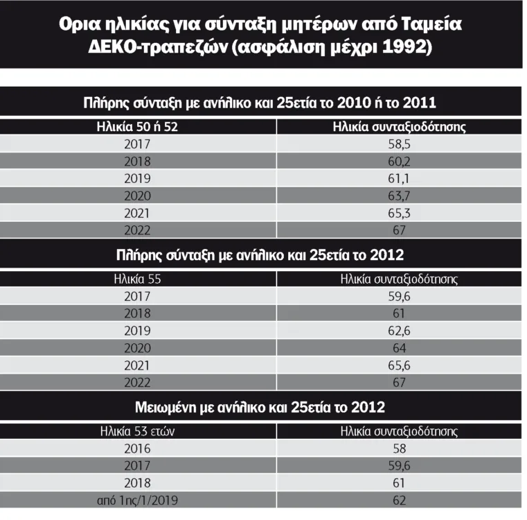 * Ανδρες και γυναίκες με έναρξη ασφάλισης μέχρι 31/12/1982 που συμπλήρωσαν 35ετία το 2019 και το 2020 σε ταμεία ΔΕΚΟ-τραπεζών, οι οποίοι μπορούν να συνταξιοδοτηθούν με όρια ηλικίας ως 61 ετών.