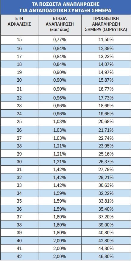 Σήµερα η αναπλήρωση στη 15ετία µόνο για το τµήµα της ανταποδοτικής είναι στο 11,55%, στην 20ετία στο 15,87%, στην 25ετία στο 20,68%, στην 30ετία στο 26,37%, στην 35ετία στο 33,81% και στην 40ετία στο 42,80%.