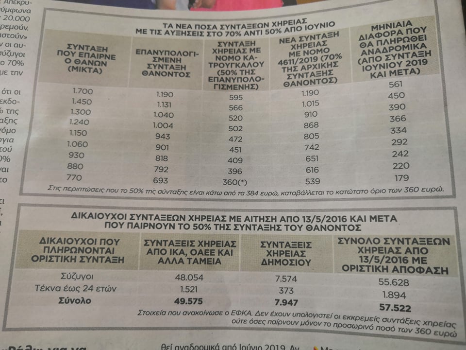 Ο ΕΦΚΑ ανακοίνωσε χθες ότι οι συντάξεις χηρείας που πληρώνονται με το νόμο Κατρούγκαλου είναι 57.522, εκ των οποίων 55.628 είναι σύζυγοι και 1.894 τέκνα θανόντων. Απέκρυψε όμως ότι υπάρχουν -σύμφωνα με εκτιμήσεις- τουλάχιστον 20.000 συντάξεις χηρείας που εκκρεμούν. Ολες θα πρέπει να «ξαναπιαστούν» από την αρχή ώστε να δοθούν οι αυξήσεις του νόμου, δηλαδή οι σύζυγοι αντί για το 50% να παίρνουν το 70% της σύνταξης του θανόντος, με την οριστική σύνταξη.