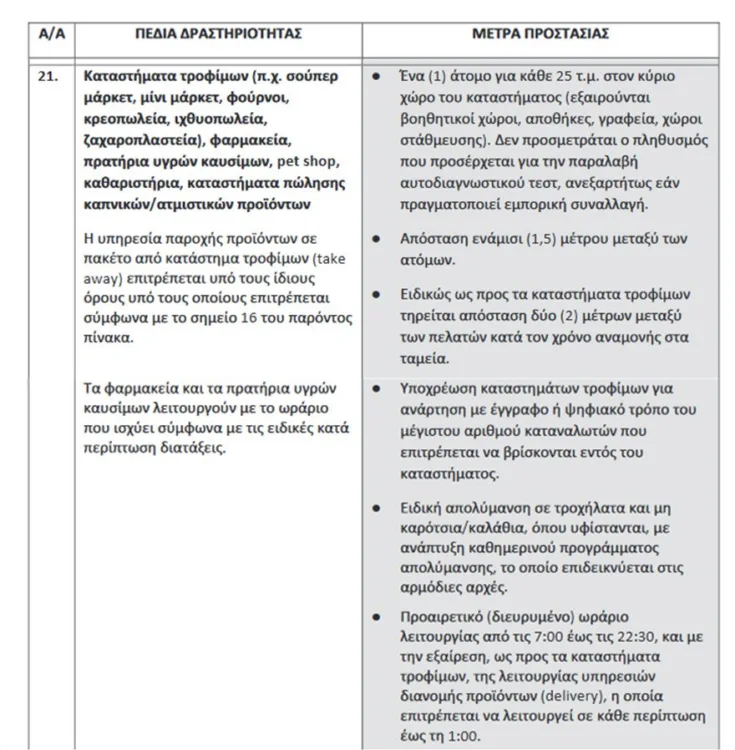 Όπως αναφέρει το νέο ωράριο προβλέπει την έναρξη λειτουργίας των εν λόγω καταστημάτων από τις 7:00 το πρωί έως τις 22:30. Τα φαρμακεία και τα πρατήρια υγρών καυσίμων λειτουργούν με το ωράριο που ισχύει σύμφωνα με τις ειδικές κατά περίπτωση διατάξεις.
