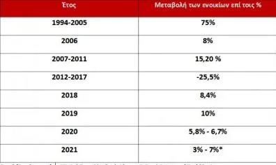 Σύμφωνα με τα στοιχεία της ΕΣΥΕ, τα ενοίκια αυξήθηκαν κατά 5 ποσοστιαίες μονάδες πάνω από τον πληθωρισμό το 2005 και κατά 5,8 ποσοστιαίες μονάδες πάνω από τον πληθωρισμό το πρώτο τρίμηνο του 2006. Ενώ από το 2007 έως και το 2011 καταγράφηκε αύξηση των ενοικίων +15,20%, από το 2012 ως το 2017 καταγράφηκε μείωση που άγγιξε το -25,5%, ενώ το 2018 επιστρέφουν με αύξηση +8,4% και το 2019 ο ρυθμός αύξησης των ενοικίων άγγιξε το +10%.