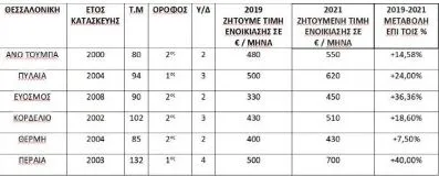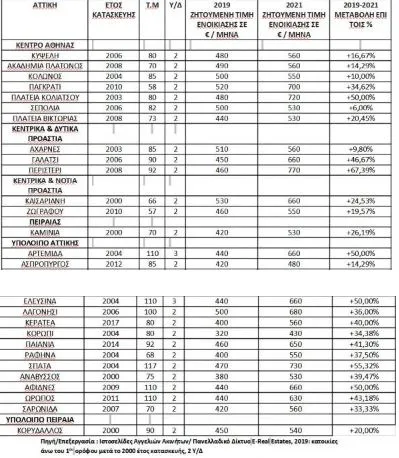 Συγκριτικοί πίνακες ζητούμενων ενοικίων 2019-2021