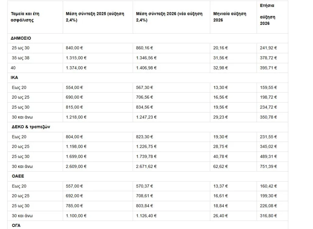 Η εφημερίδα Ελεύθερος Τύπος παρουσιάζει παρακάτω τον πίνακα με τις αυξήσεις συντάξεων γήρατος για το 2026 ανά Ταμείο: