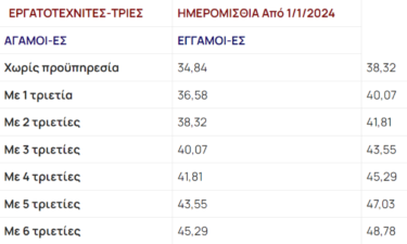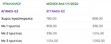 Τονίζεται ότι , στο πλαίσιο της επαναφοράς καταβολής του επιδόματος προϋπηρεσίας, από την 1η Ιανουαρίου του 2024, η ΓΣΕΕ ενημερώνει τους εργαζόμενους και τις εργαζόμενες σχετικά για τα ποσά που θα ισχύουν από εδώ και στο εξής στον κατώτατο μισθό με τις τριετίες και το επίδομα γάμου. Υπενθυμίζεται ότι άλλαξε το πλαίσιο καταβολής του επιδόματος προϋπηρεσίας, μετά την κατάργηση του άρθρου για την οριζόντια αναστολή κάθε κανονιστικής διάταξης, βάσει της οποίας προβλεπόταν η προσαύξηση των αποδοχών των εργαζομένων λόγω προϋπηρεσίας.