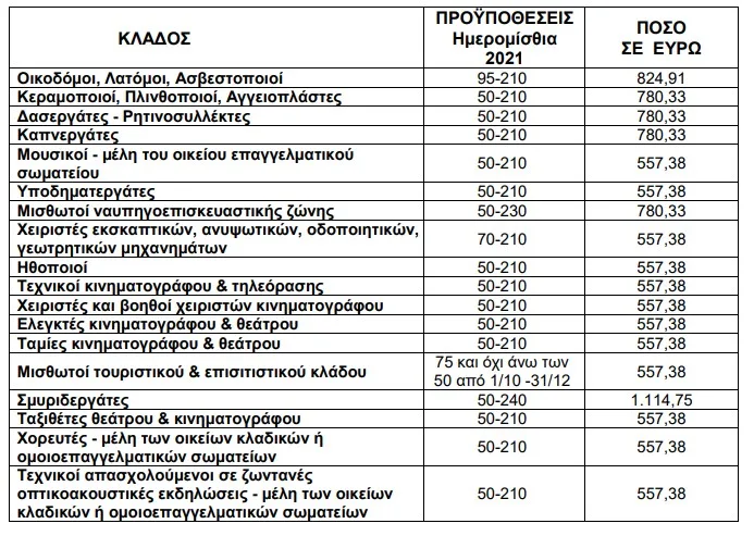 Οικοδόμου, λατόμου, ασβεστοποιού, κεραμοποιού, πλινθοποιού, αγγειοπλάστη, δασεργάτη, ρητινοσυλλέκτη, καπνεργάτη, μουσικού – μέλους του οικείου επαγγελματικού σωματείου, υποδηματεργάτη, μισθωτού ναυπηγοεπισκευαστικής ζώνης, χειριστή εκσκαπτικών, ανυψωτικών, οδοποιητικών, γεωτρητικών μηχανημάτων, ηθοποιού, τεχνικού κινηματογράφου και τηλεόρασης χειριστή και βοηθού χειριστή κινηματογράφου, ελεγκτή κινηματογράφου και θεάτρου, ταμία κινηματογράφου και θεάτρου, μισθωτού τουριστικού και επισιτιστικού κλάδου, σμυριδεργάτη, το επάγγελμα του ταξιθέτου θεάτρου – κινηματογράφου, του χορευτή – μέλους των οικείων κλαδικών ή ομοιοεπαγγελματικών σωματείων, καθώς και του τεχνικού απασχολούμενου σε ζωντανές οπτικοακουστικές εκδηλώσεις – μέλους των οικείων κλαδικών ή ομοιοεπαγγελματικών σωματείων.