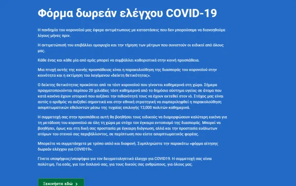 Η συμμετοχή σας στην προσπάθεια αυτή θα βοηθήσει τους ειδικούς να διαμορφώσουν καλύτερη εικόνα για τη μετάδοση του κοροναϊού σε όλη τη χώρα με στόχο τον έγκαιρο εντοπισμό της διασποράς. Μπορεί να βοηθήσει, όμως και στη δική σας προστασία με έγκαιρη διάγνωση, αλλά και την προστασία ευάλωτων ατόμων του στενού σας περιβάλλοντος, σε περίπτωση που είστε ασυμπτωματικός φορέας. Μπορείτε να συμμετάσχετε με τρόπο απλό και διαφανή. Συμπληρώστε την παρακάτω «φόρμα αίτησης δωρεάν ελέγχου για COVID19».