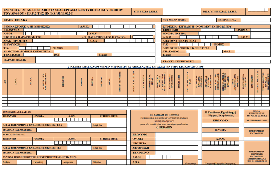 3.Σε περίπτωση που εναλλάσσεται το εξ αποστάσεως προσωπικό της επιχείρησης, στη στήλη ΩΡΕΣ ΕΝΑΡΞΗΣ & ΛΗΞΗΣ, ΗΜΕΡΕΣ ΕΡΓΑΣΙΑΣ, αναγράφονται οι ημέρες που ο εργαζόμενος παρέχει την εργασία του εξ αποστάσεως, εντός του οριζόμενου χρονικού διαστήματος. Στο ίδιο πλαίσιο, παρέχεται η δυνατότητα στους εργοδότες να τροποποιούν το Έντυπο Ε.4.1., ανάλογα με τις εκάστοτε ανάγκες της επιχείρησης.