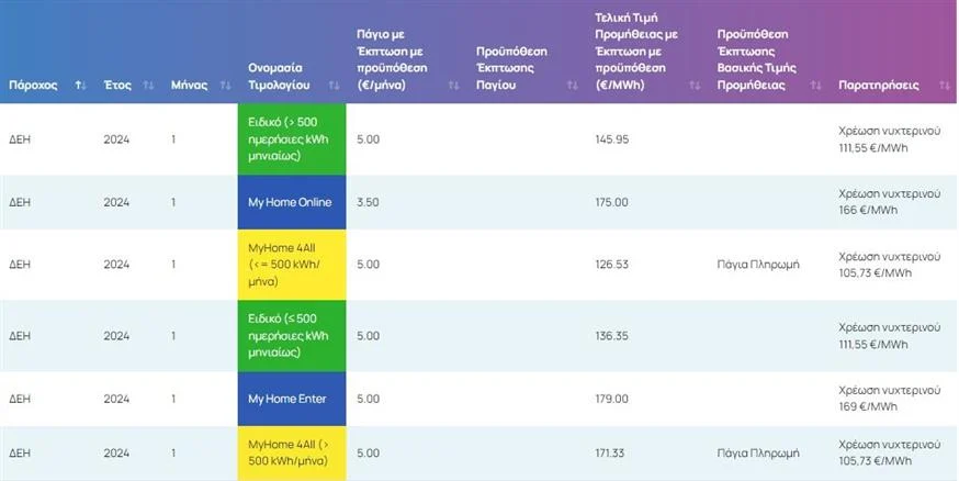 Ο πίνακας περιλαμβάνει την πάγια χρέωση και την τελική τιμή προμήθειας του σχετικού μήνα, κατόπιν υπολογισμού τυχόν εκπτώσεων. Για τη διαφανή ενημέρωση των καταναλωτών, αναγράφεται η προϋπόθεση βάσει της οποίας χορηγείται η εκάστοτε έκπτωση.